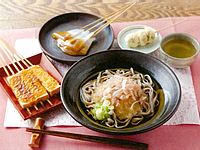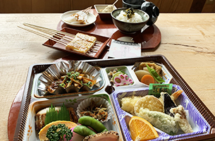 ・おろしそば(県内産そば粉使用) ・若狭牛丼(大野米使用) ・名物とうふ木の芽田楽(2本) ・揚げ物 ・名物こんにゃくおでん ・焼き物